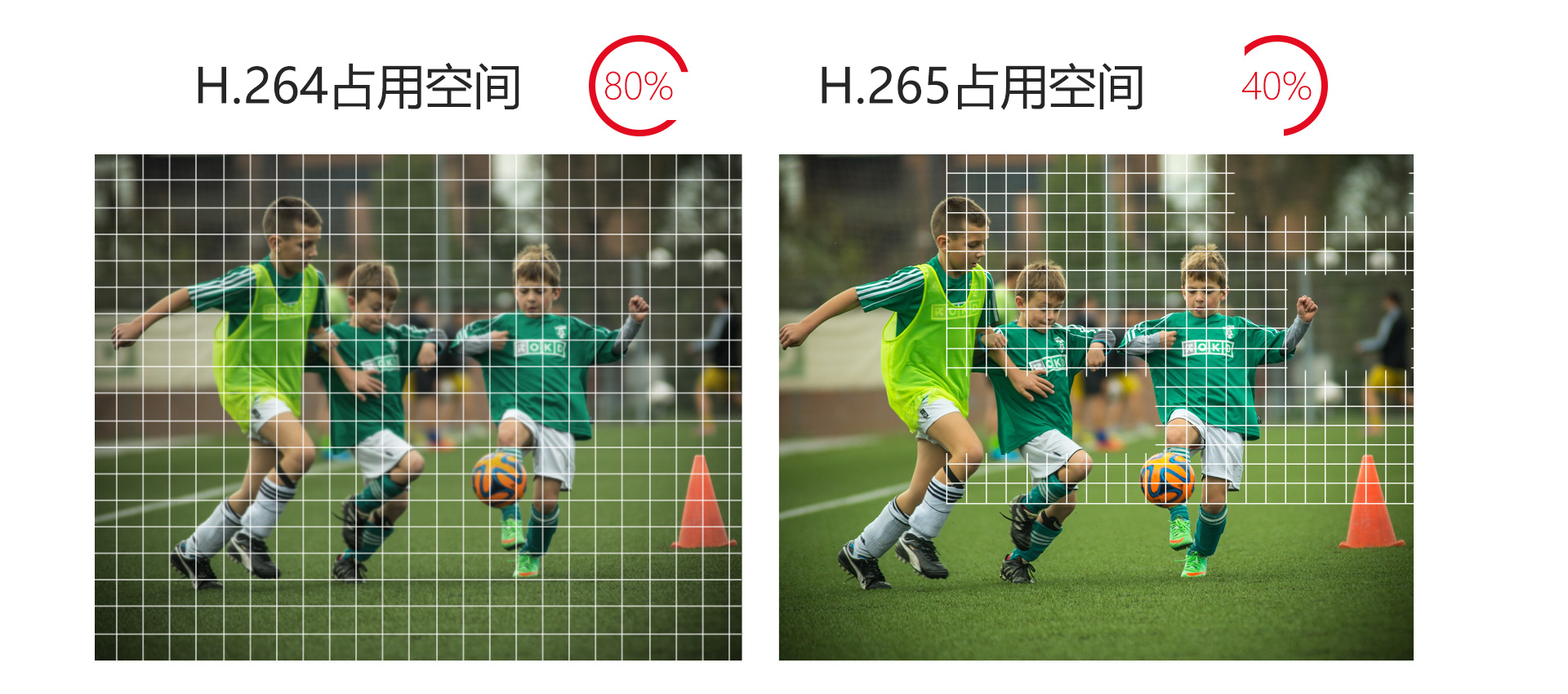 與H.264相比,降低約39-44%的存儲(chǔ)占用空間。不再畏懼因長期的監(jiān)控工作帶來的存儲(chǔ)不足的困擾。