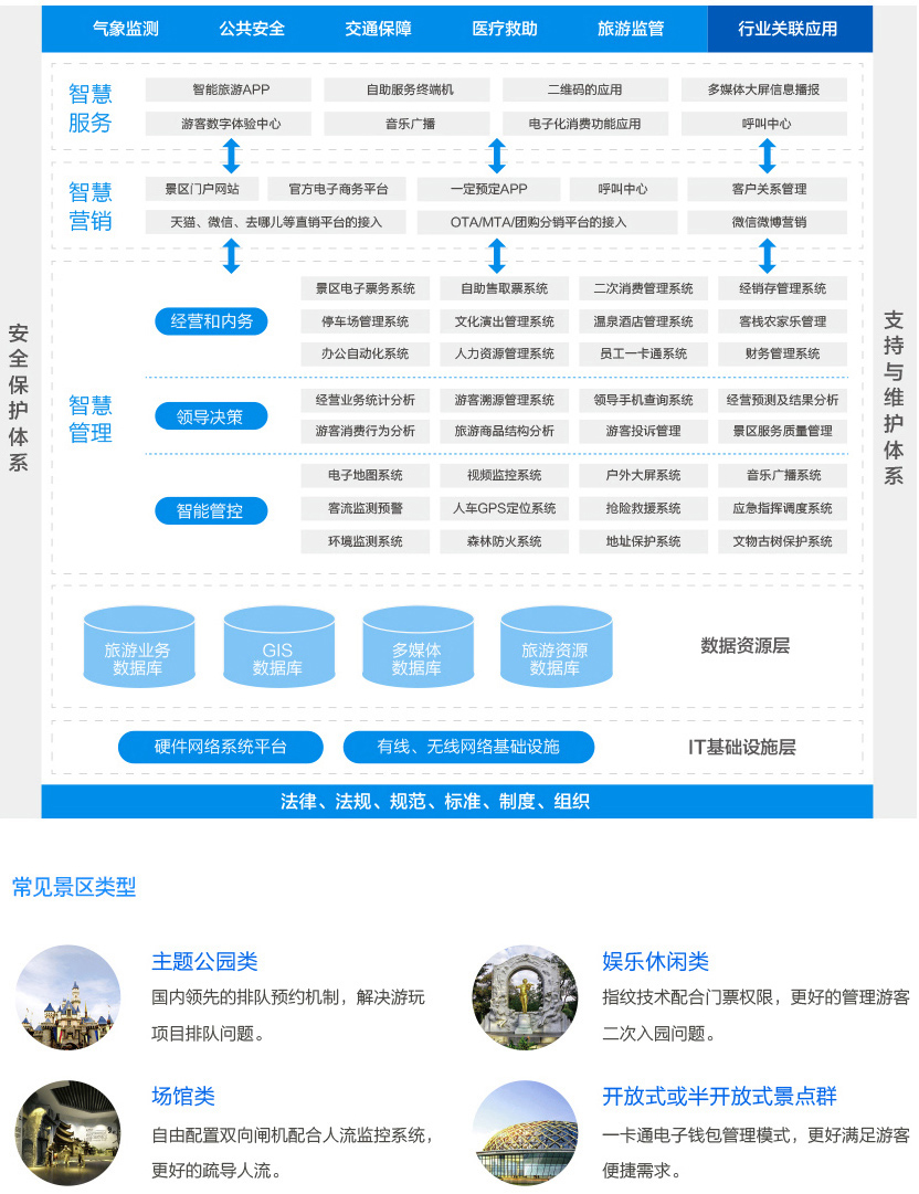 智慧景區(qū)解決方案,應用先進的物聯(lián)網(wǎng)感知技術、RFID中間件技術、信息集成技術、移動支付技術,實現(xiàn)了“軟硬件”技術跨界整合,開拓了景區(qū)智慧化管理的創(chuàng)新之路;實現(xiàn)以游客體驗為核心的景區(qū)服務體系、以安全保障為核心的景區(qū)管理體系、以電子票務為核心的景區(qū)營銷體系,